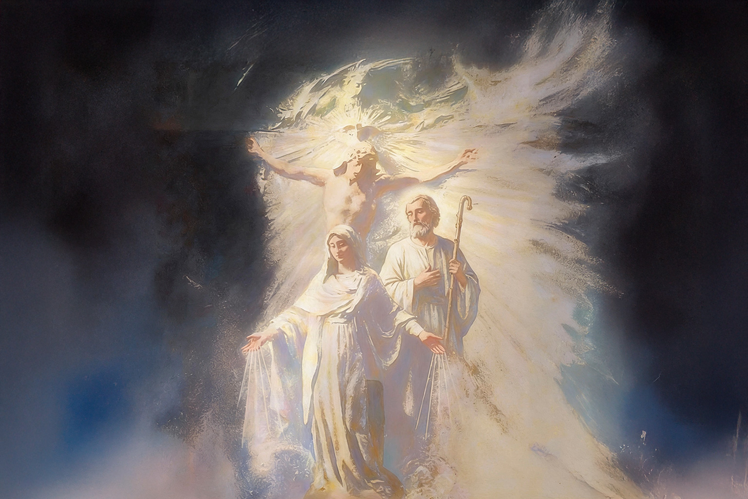 La mujer de azul es la Santísima Virgen María; el hombre de marrón es San Vicente Ferrer y el hombre de blanco, San Vicente Martín. La copa es el Santo Cáliz, ubicado en la Catedral de Valencia, que ha sido estudiado por investigadores valencianos como don Jorge Manuel Rodríguez, junto con la Sábana Santa y el Santo Sudario de Oviedo. Existen demostraciones científicas que apuntan, con un 99,8 % de fiabilidad, a que el Santo Cáliz es la copa de la Última Cena de nuestro Señor Jesucristo antes de su dolorosísima Pasión.
